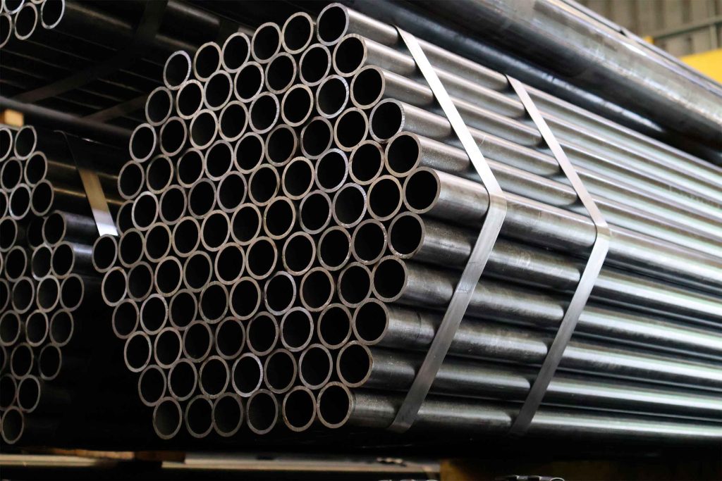 Estoque de tubos de aço carbono redondos, com diferentes diâmetros, prontos para distribuição no estoque industrial.