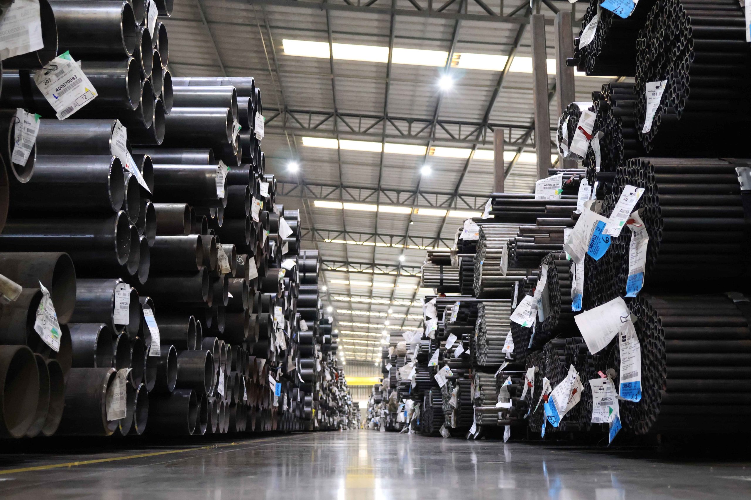 Corredor de depósito industrial com pilhas altas de tubos de aço estruturais redondos de diferentes tamanhos, estocados com etiquetas.